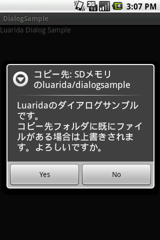 このプログラムを実行すると、/sdcard/luarida/dialogsample/フォルダにスクリプトがコピーされます。後は、luarida.luaにファイルを手動で登録してください。一度実行すれば、後はアンインストールしても大丈夫です。