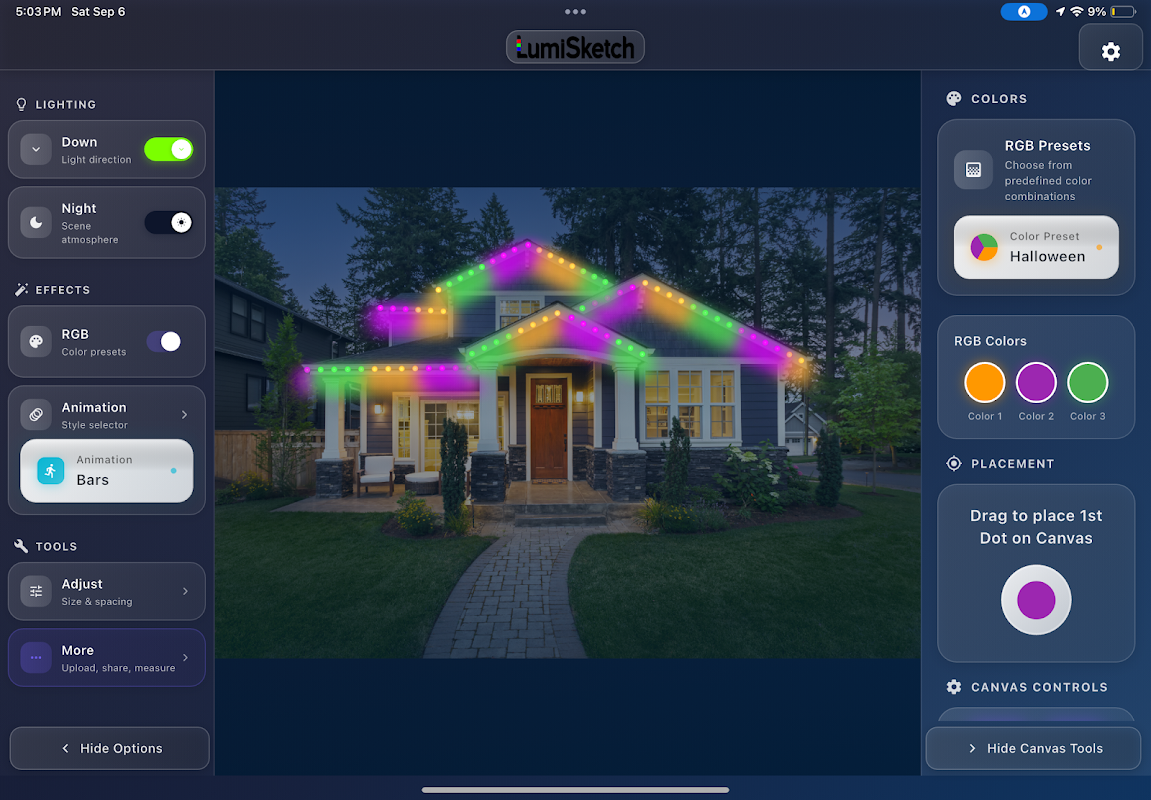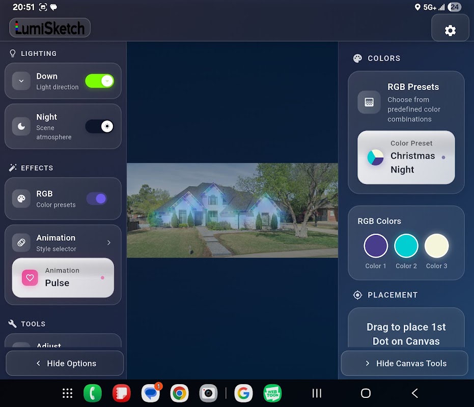LumiSketch Mobile 是永久照明安装人员、户外装饰师和创意专业人士的首选模型工具。上传照片,点击放置动画 RGB 灯,可视化间距、颜色过渡和自定义图案,然后将您的设计导出为视频,立即与客户分享。