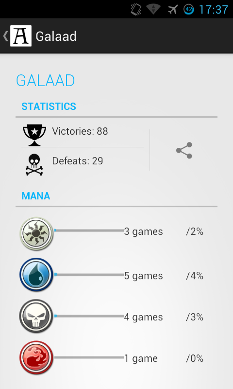 Magic Assemble can also synchronize your game statistics across all your devices! Then you can consult your count of victories, or the number of times you have played with a black deck. You can use the app on your smartphone, and retrieve your statistics later on your tablet. It's really simple, and even works offline!