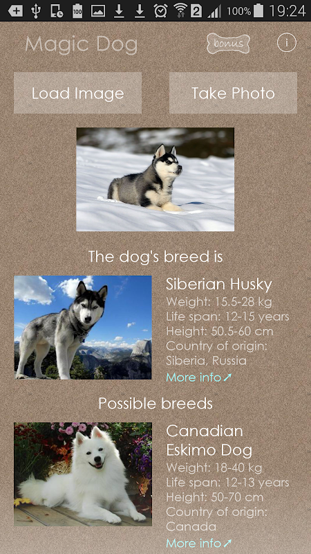 Take a photo of the dog, upload the image, and then MagicDog will tell you everything about it. You'll receive information about the dog's breed, its size, its life span, specific traits, and typical behavior.
