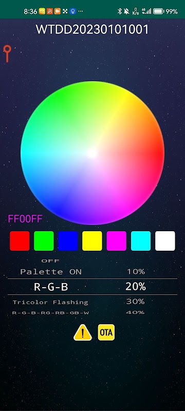 This is an app developed in-house for controlling in-car ambient lighting devices. It features color settings, ambient light pattern configurations, brightness adjustment, and a multifunctional ambient light with a music mode. Additionally, it offers Over-The-Air (OTA) upgrade functionality.