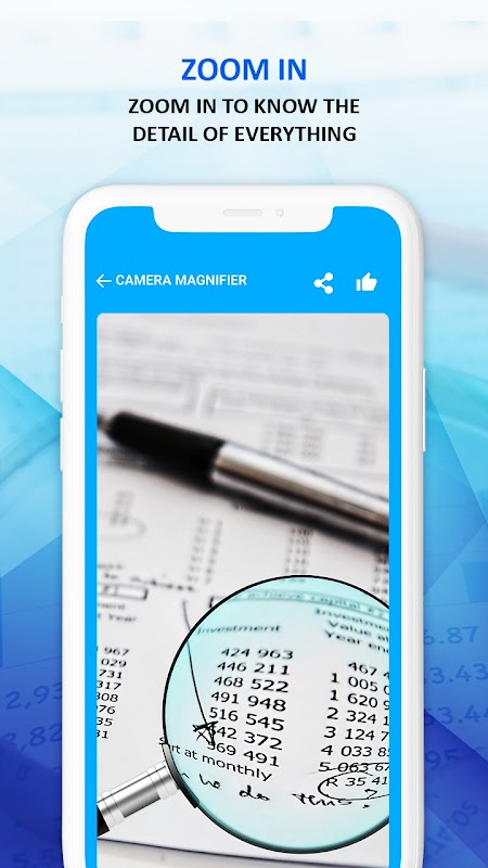 This Magnifying app turns a mobile into a digital magnifier, Which magnify small labels, texts or any thing which comes in your mind. With the help of flash light you can magnify any object in the dark also.