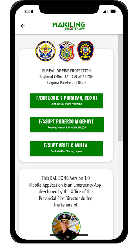 This app was developed by the BFP Laguna Provincial Office under the leadership of SUPT NONILON L MACASADIA II. This app can be used in times of disaster and emergencies where the community can easily contact an emergency agency with a fewer taps on the app and can easily locate the exact geographical location of a certain emergency agency office within Laguna Province.