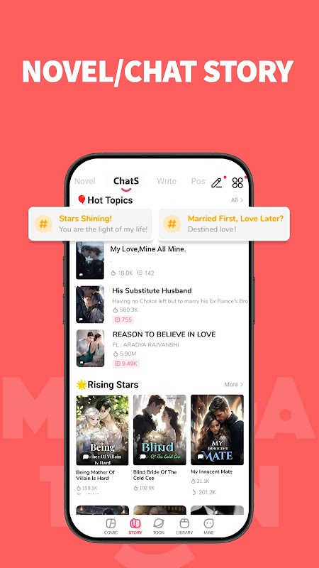 - 在MangaToon,除了阅读漫画,你还可以找到许多精彩的聊天故事。聊天故事是一种新的小说形式,故事以聊天的形式展开。聊天故事有着扣人心弦的情节,充满想象力的世界观,更轻松的阅读体验,让你阅读故事就像和朋友聊天一样轻松。