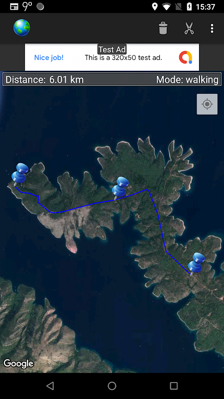 Create the path by tapping the map. Different modes of path creating are available: direct, driving, walking and bicycling. Direct mode draws straight lines between points. Driving, walking and bicycling modes are able to find and follow roads between points. Driving mode finds routes using the roads network. Walking mode uses pedestrian paths and sidewalks (where available). Bicycle mode uses bicycle tracks and preferred streets (this is currently available only in US). Distance between first and last point is shown on the top of the screen.