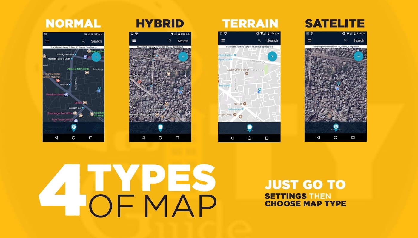 * Choose any from 4 map type like Normal, Hybrid, Satelite, Terrine.