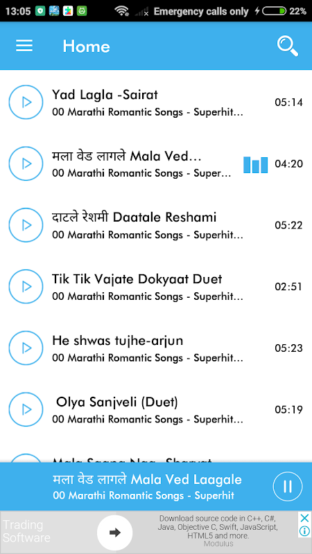 This app contains timeless romantic Marathi hit songs. Collection of 120 most romantic Marathi songs ever made. This app is completely free and you can download songs offline and play without internet.
