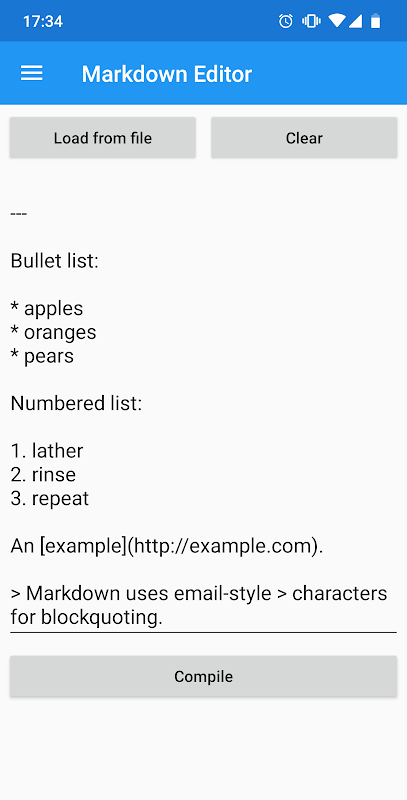 首先,在编辑器页面上输入Markdown文档内容(通过键入或通过复制粘贴或从文件加载)。准备好文档后,单击“编译”按钮,这会将您转移到显示已编译文档的页面。