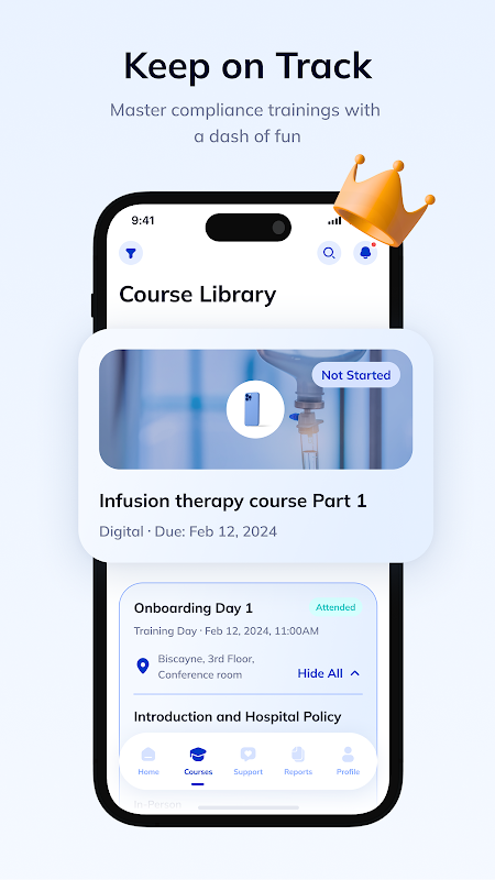 在应用程序中访问您的所有合规课程,并在您准备好继续时无缝地从您上次停下的地方继续。同时参与多门课程并轻松监控您的进度。轻松检索证书和成绩单,确保细致的记录保存。