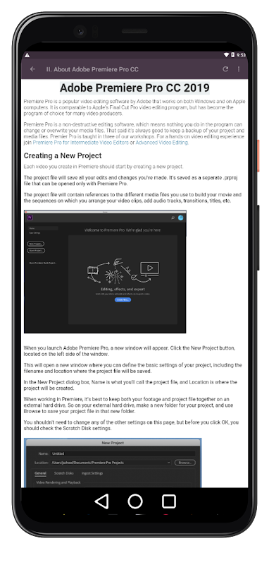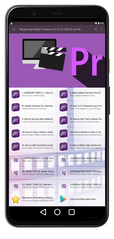 The app will dive straightaway into having you create your first video, with sound, music, images and text. No time is wasted with unnecessary concepts. You will be up and running in Premiere in 45 minutes.