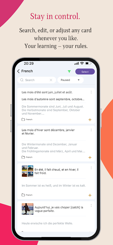 您可以随时调整重复计划、编辑或删除卡片——Masterix 会根据您的学习方式进行调整。