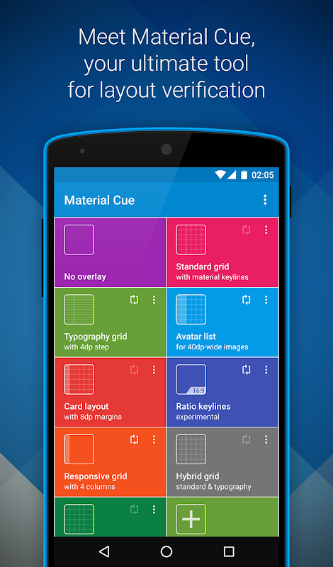 Material Cue is a professional tool that draws grids and keylines over the device screen, helping developers to better design their apps. It is a must-have tool for every Android developer, designer or tester who is considerate about Material Design.