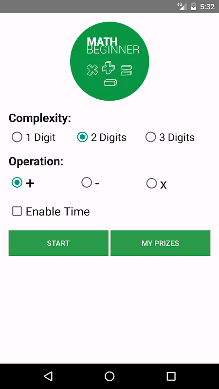 “数学初学者”应用程序是一个包含简单数学问题的多项选择测验。首先,用户必须选择所需的运算,可以是加法、减法或乘法。然后,他必须选择问题的位数,我称之为复杂性。值得一提的是,由于难度,乘法只有1位数或2位数选项。最后,如果他愿意,他可以启用时间选项来完成测验。总共有10个问题尝试。每个正确的答案给用户10分。当用户得分最高(100)时,他将赢得不同的奖品,具体取决于所选的操作/复杂性:1位数问题的星星,2位数问题的徽章和3位数问题的奖杯。