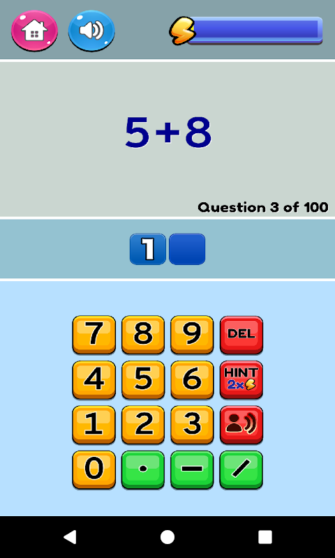 对于每个类别,选择10、25或100个问题。所有问题都是随机产生的,因此每个测验都是完全唯一的。为每个正确的答案赚取能量(每个数字一个能量),在困住时使用您的能量获取提示(每个提示2个能量),每次挑战最多可获得5个奖励。奖励包括Perfect 10,Perfect 25,Perfect 100和1000 Energy获得的徽章。