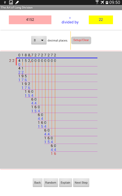 Long division is among the most notorious topics in school mathematics. However, it is also one of the most fruitful topics that allow children to have fun with mathematical thinking, if it is explored in a meaningful way. It combines addition, subtraction, multiplication, and, of course, division in a network of number senses. The key is balancing the procedures and the concepts behind the long process and allowing children to talk about the ideas and the patterns. Once children learned to enjoy the art and joy of long division, they may have a better experience with the mathematics that follow. And, yes, they should be allowed to use calculators for quick solutions later on. This app was inspired by two seven-year-olds I worked with about long division in late 2016. They enjoyed the art of long division and kept asking for more problems and sharing the patterns they discovered. Importantly, long division should not be forced on school children; but it can be a pleasurable experience for them to play with mathematics. There are, of course, other variations of the long division format.