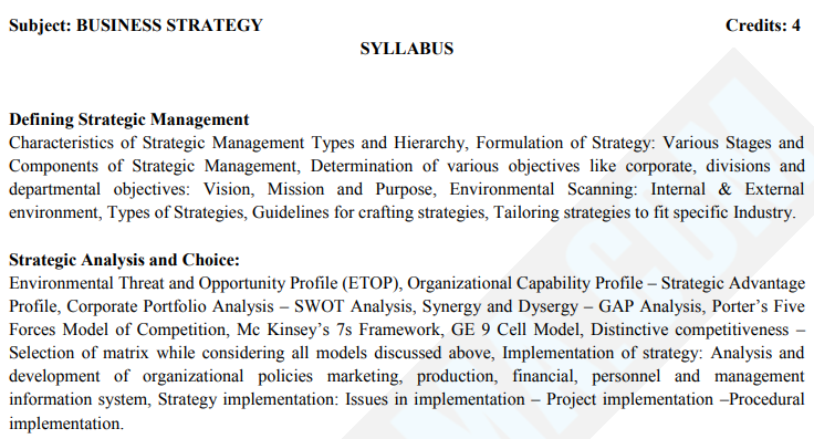 Strategic Analysis and Choice - Environmental Threat and Opportunity Profile (ETOP), Organizational Capability Profile, Strategic Advantage Profile, Corporate Portfolio Analysis, SWOT Analysis, Synergy and Dysergy, GAP Analysis, Porter's Five Forces Model of Competition, Mc Kinsey's 7s Framework, GE 9 Cell Model, Distinctive competitiveness, Selection of matrix while considering all models discussed above, Implementation of strategy: Analysis and development of organizational policies marketing, production, financial, personnel and management information system, Strategy implementation: Issues in implementation, Project implementation, Procedural implementation.