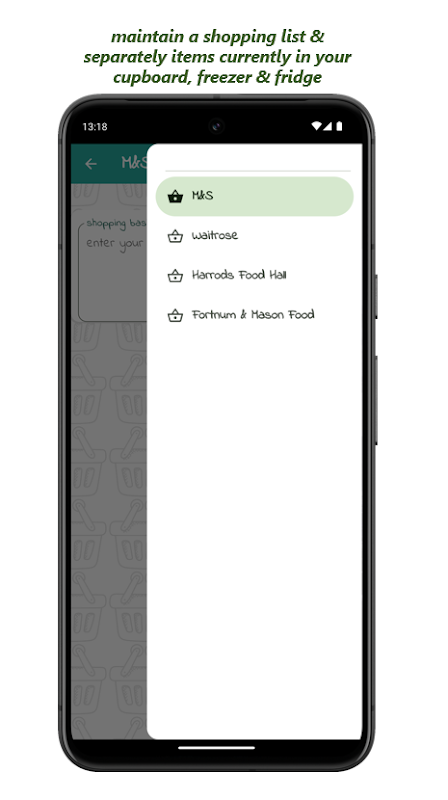可以通过向右滑动来编辑其他列表,或者通过向左滑动来删除其他列表,您可以从最后的抽屉中选择所需的类别(购物、橱柜、冰箱或冰柜列表)。