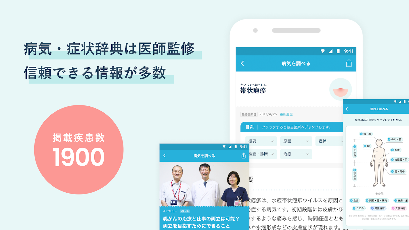 除了可搜索 1,900 种疾病的“疾病/症状词典”,以及可让您直接咨询以各科室专家为中心的医疗团队并获得医疗问题答案的“医疗咨询”,取决于您的病情。地区和临床科室。我们提供诸如可以搜索的“医院搜索”和可以在生病或受伤时用作参考的“指南功能”等服务。您不仅可以通过“流感”等疾病名称进行搜索,还可以通过其症状进行信息搜索,在传染病流行的季节可以加深对疾病和治疗方法的了解。