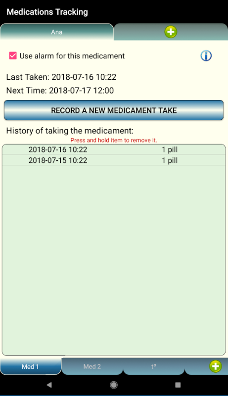 With Medications Tracking you can track what you took and when. You can set an alarm so you do not miss taking the medicine. And you can do that for more then one person. You can add as many people as you want and keep track of their medications.