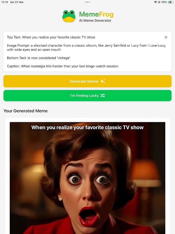 懒得想提示?只需点击“我感觉很幸运”,MemeFrog 就会用随机表情包给您带来惊喜。非常适合带来笑声、灵感或你不知道自己需要的值得模因的时刻。