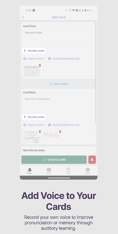 为任何学习内容打造你的专属卡组。添加文字、图片甚至语音,让你的闪卡独一无二。