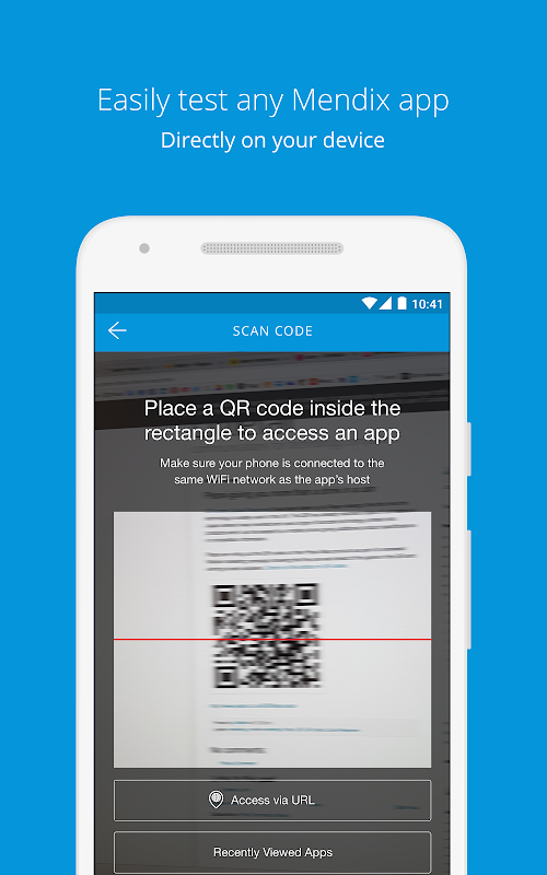 QR码扫描功能,您可以轻松地预览和任何设备上测试移动应用 - 无需通过建立和安装的应用程序特定的本地程序包的麻烦去。要查看设备上的任何Mendix移动应用程序,只要打开该QR扫描和扫描在Mendix建模器中显示的代码。