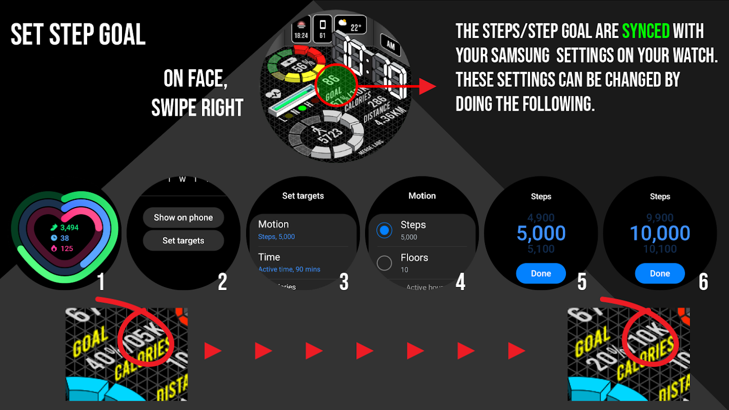 - 显示带有图形指示器的每日步数计数器。步数目标通过 Samsung Health 应用程序或默认健康应用程序与您的设备同步。图形指示器将停在您同步的步数目标处,但实际的数字步数计数器将继续计算步数,直至 50,000 步。要设置/更改您的步数目标,请参阅说明中的说明(图片)。与步数一起显示的还有消耗的卡路里和以公里或英里为单位的行驶距离。将显示绿色复选标记,表示已达到步数目标。 (完整详情请参阅说明)