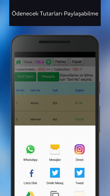 - Hesaplanan faturaların paylaşılabilmesi (Whatsapp,Sms,E-posta..vb)