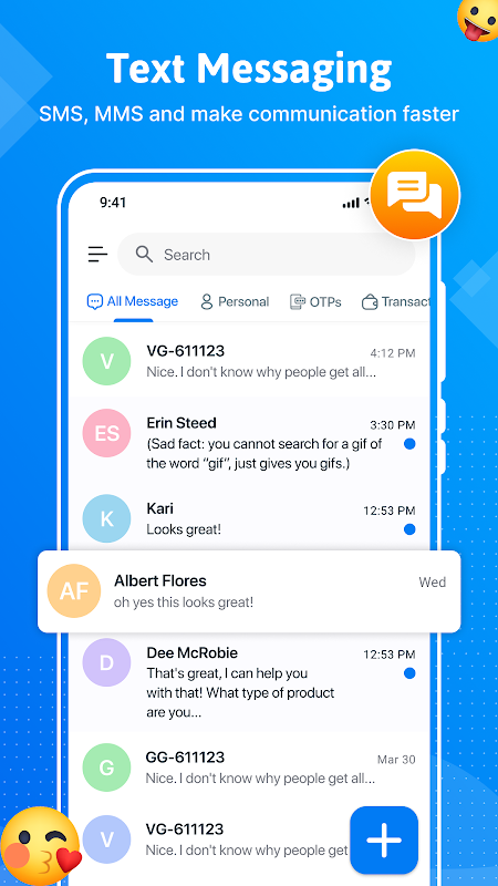SMS Messenger 实时传送消息,确保您保持联系而不会出现任何延迟。告别等待消息传送或对话加载 - 使用 Quick Messenger,您的消息眨眼间即可到达,使沟通快速高效。