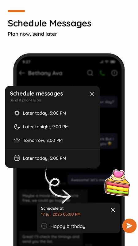 定时发送消息:设置稍后发送的文本消息,非常适合提醒、生日和约会。