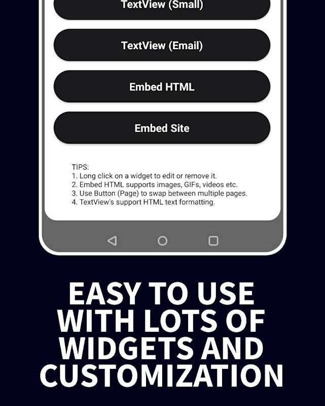 MiAPP 支持大量的小部件,还有更多正在开发中,从大量按钮到完全嵌入支持。设置按钮以打开 URL、页面、创建支持 HTML 格式的长文本、将电子邮件地址附加到您的文本、嵌入网站,甚至嵌入一些图像或视频。以无限的潜力释放您的创造力。