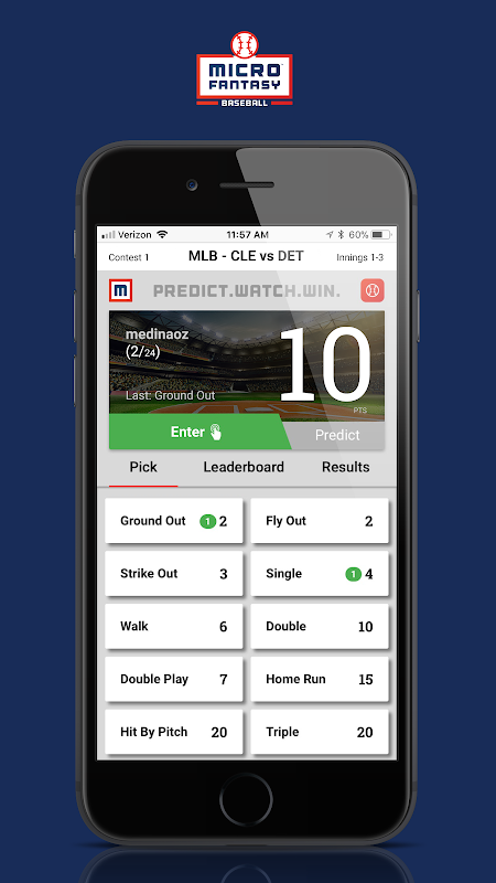 One touch to predict live outcomes per play or at bat while watching any baseball, football, or basketball