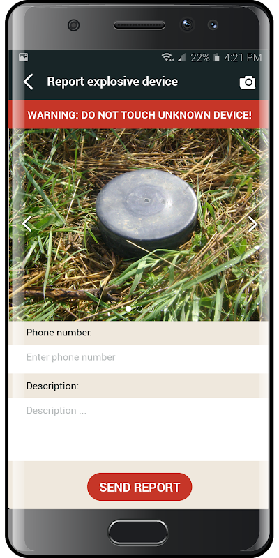 如果遇到您怀疑是炸药未知的话题,你可以通过一个应用程序,报经授权的服务。该应用程序允许您拍摄照片,写一个主题和位置的描述,并且应用程序计算出与其他数据一起发送到主管服务的位置。