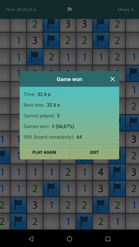 - Advanced (board 16x16, 40mines, guess-free only option)