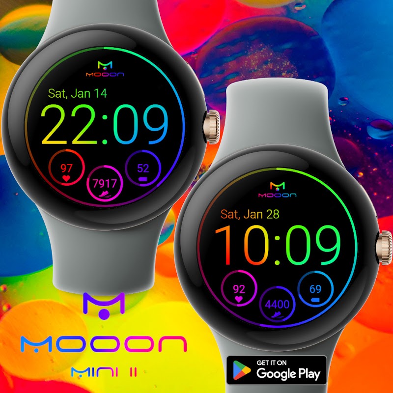 多彩表盘,带有适用于 Wear OS 的数字时钟、日期、计步器和心率监视器。