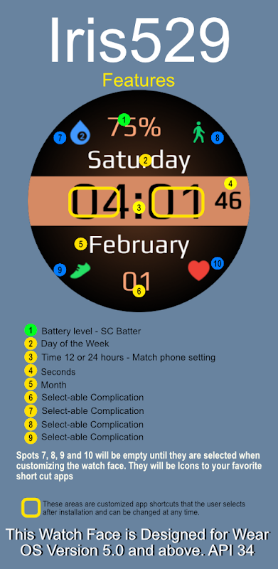 • 兼容性:此表盘与 Wear OS 5.0 及更高版本以及 API 级别 34 兼容