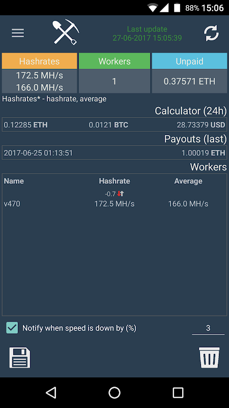 Watch your mining rigs from your mobile. This application shows the current speed, balance and a lot of various information. With the notification function, you will always know about problem mining.