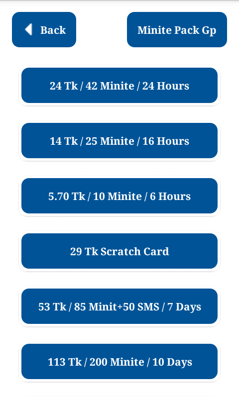 ”Minite pack gp - মিনিট প্যাক জিপি” আমাদের এ এ্যাপস টিতে জিপি সিমের সকল নতুন আপডেট বিভিন্ন মিনিট প্যাকেজ এর তথ্য দিয়ে সাজানো হয়ছে। আপনাদের আর কষ্ট করে দোকানদার দের বলতে হবে না শুধু মাত্র আমাদের এ এ্যাপস আপনার মোবাইল এ থাকলে আপনি নিজে নিজেই বিভিন্ন মিনিট প্যাকেজ নিতে পারবেন অতি সহজেই । যেভাবে মিনিট নিবেন , প্র্রথমে কোন প্যাকেজ টি নিবেন তা দেখুন, এবং সে প্যাকেজ টির activation code Dial এর উপর চেপে ধরে কোডটি সিলেট করে তা Copy করে ,আপনার মোবাইলের Keypad এ তা Paste করুন । তাহলে নির্দিষ্ট পরিমান মিনিট প্যাকেজ টি পেয়ে যাবেন।