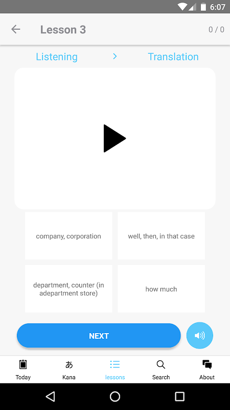 - 「学习」: 听到读音后,输入相应的平假名,以更加互动和容易的方法学习每组字句。这个训练有助加强聆听、阅读和写作能力。功能设有不同学习模式,你可以顺着每节课堂里词汇出现的次序来做测试,亦可以选择随机抽取词汇。另外,你可以选择在有提示之下做练习。