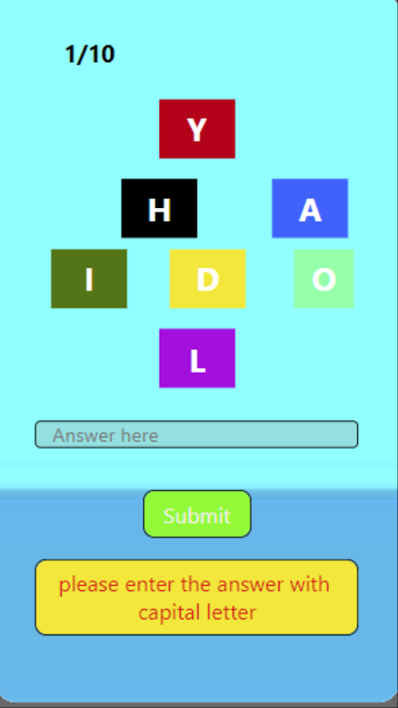 找到打乱的单词是游戏的目标。通过这个游戏,用户的思维能力得到了提高。该游戏可以离线玩,对于缓解压力和磨练思维很有帮助。