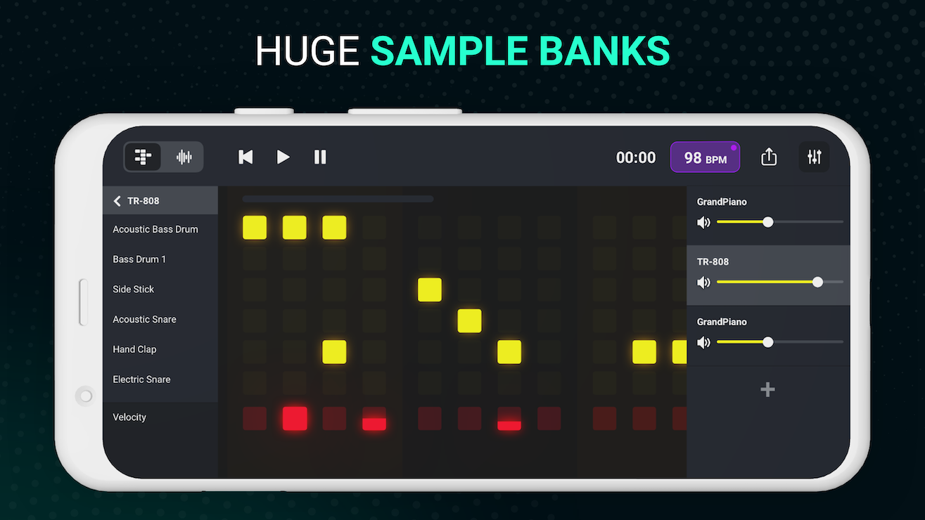 缺少吉他声吗?也许您需要一些器官或口琴的声音? Mix Up Studio提供了多种乐器:选择最合适的乐器,然后使用音序器编写其音色。