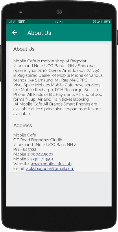 Mobile Cafe在Ugo银行附近的Bagodar Jharkhand的移动商店中-NH 2,商店于2010年开业。所有者Amit Jaiswal(Vicky)是三星,MI,RealMe,OPPO,Vivo,Spice Mobiles等各种品牌的手机的注册经销商。 .Mobile Cafe提供服务,例如Mobile Recharge,DTH Recharge,Sell Jio Phone出售,各种账单付款,各种工作表格填写,机票和火车票预订。\ n在Mobile Cafe提供所有品牌的智能手机,且价格低廉还提供键盘手机。