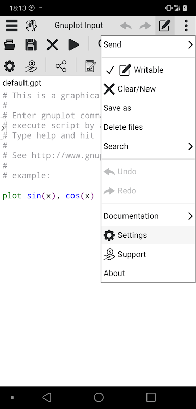 Gnuplot使用一个shell窗口来交互式输入文本命令,并使用一个输出窗口来同时显示grapical输出。在诸如智能手机或平板电脑之类的移动设备上,此工作流程不合适,因为用户只有一个小屏幕,很难在屏幕上拥有多个输入/输出区域。要在移动设备上使用出色的gnuplot程序,我已编写了此应用程序。