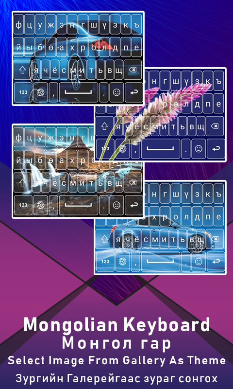 The new Mongolian English Keyboard is the new way to use your default mobile keyboard with multiple colors, beautiful backgrounds, emoji keyboard for mobile and much more. This is best keyboard theme that likely compatible with android keyboard and best app to customize keyboard with new look. Download latest colorful theme keyboard with keyboard wallpaper to give change your phone look into a new way.