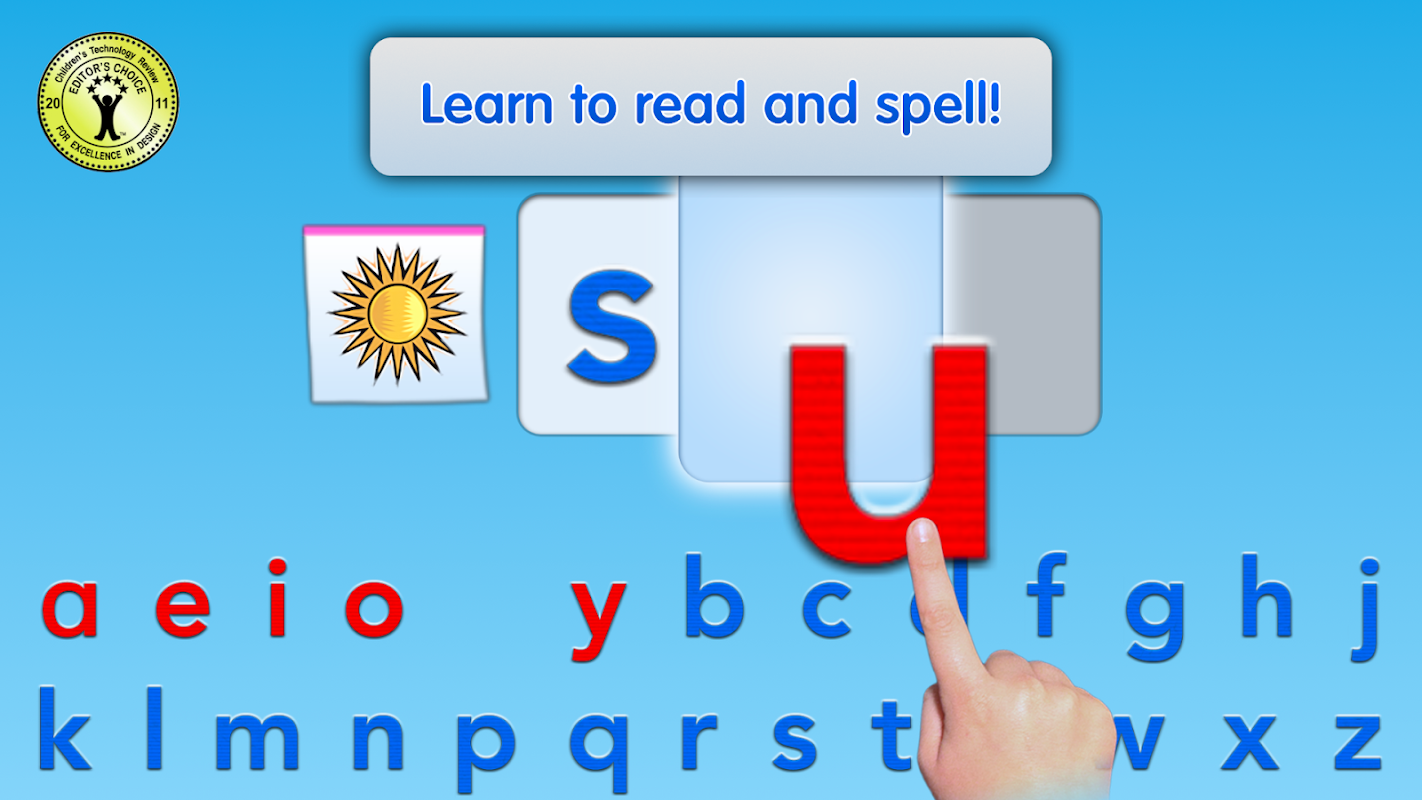 首先,该应用程序通过让孩子触摸空白矩形来告诉孩子单词是由声音/语音(音素意识)组成的,在这些矩形中必须拖动字母才能完成单词并听到字母的相应发音。
