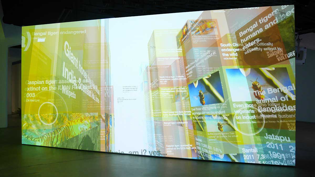 媒体艺术、歌词、有关人口发展和动物灭绝的事实被汇集在一个独特的跨学科项目中:接收者以一种有趣的方式乘坐虚拟飞行穿过大都市,而没有表现出任何道德上的指责。由文字和图像搭建而成的高楼大厦,构成了一本三维的书。接收者通过一个透明的建筑进行自我控制,其中包括联合国人口数量(事实)、作者个人观点的俳句(诗歌)以及 21 世纪宣布灭绝的动物物种。该项目含蓄地提出了问题,但没有明确回答这些问题: