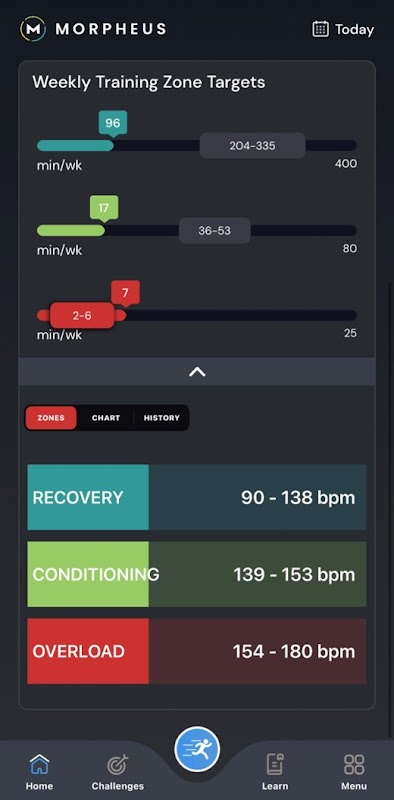 要求:要解锁每周区域目标,需要 Morpheus HRM。否则,Morpheus 无法计算恢复分数或提供个性化的心率区和目标。