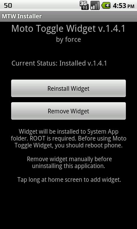 窗口小部件应在任何Android 2.2及更高的移动设备工作,但皮肤是高度定制的MotoBlur手机(它看起来像相同的其他部件模糊像GPS / WIFI /蓝牙切换)。