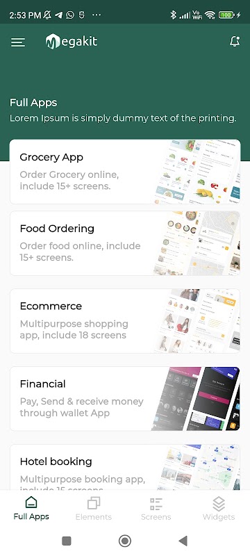 Multikit is 12 UI Component + UI kit about E-commerce, Fitness, Cab Booking, Chat, Grocery, Blog, Learning, Nft, Food Ordering, Hotel Booking, Financial App, This UI Kit comes with around 100+ Screens and it will works in both platform android and iOS. Multikit has few additional features like Shimmer effect, Multi-currency, Multi-language and RTL support. This UI enable you to develop beautiful and feature-rich apps.you can take some part of code whatever you like and implement it into your code. Our Code is well organised with all folders, file name, class name variable and functions under 70 lines. As well as it's well-named make this code easy to reuse and customise .This app has feature like Light and Dark mode.