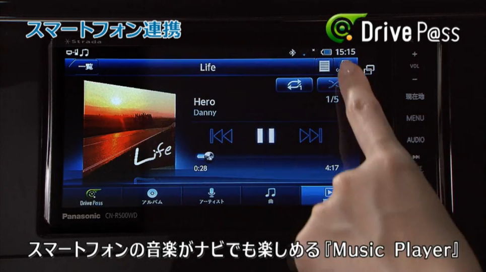 通过将安装了“Music Player for Drive P@ss”的Android智能手机连接到支持“Drive P@ss”的汽车导航系统,您可以通过汽车扬声器以优美的音质欣赏您平常听的音乐。